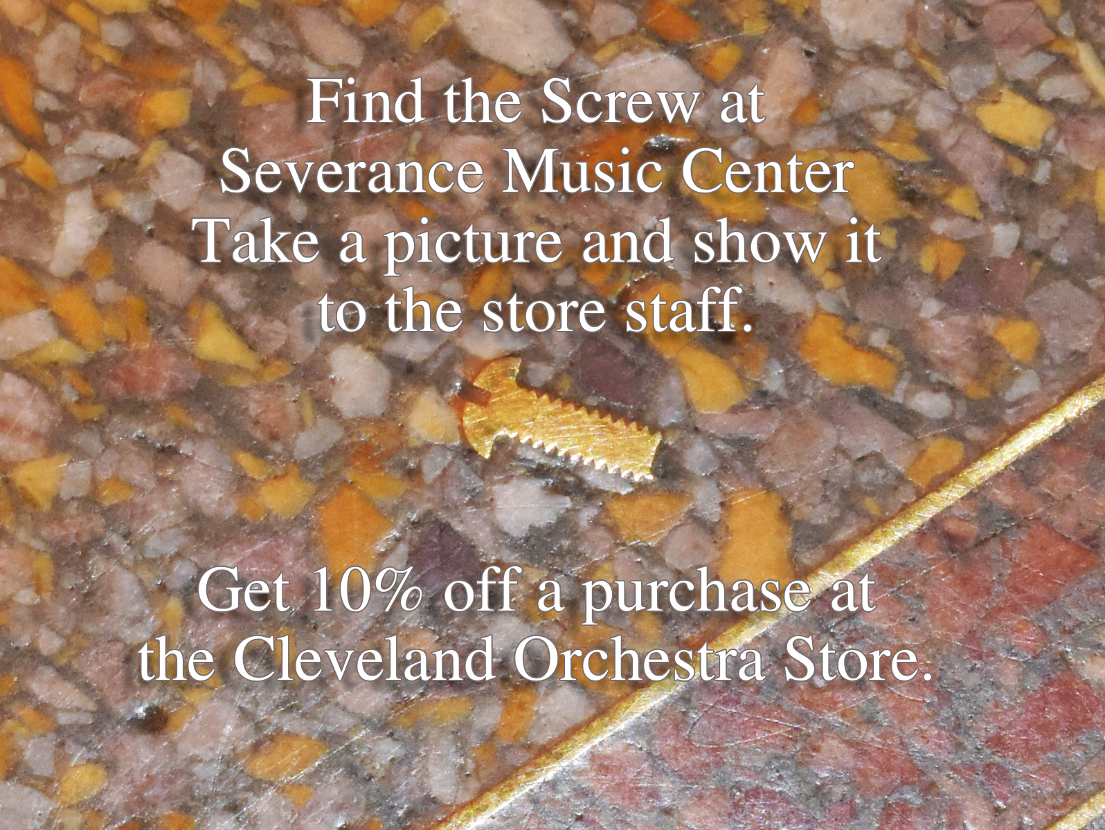The stories of the screw lodged in Severance Music Center's beautiful terrazzo floor vary. We might never know whether it was placed in a fit of pique or fell from a work's fingers, what we do know is that the screw is there to stay. Guests visiting The Cleveland Orchestra have long played a game of finding the shining object.